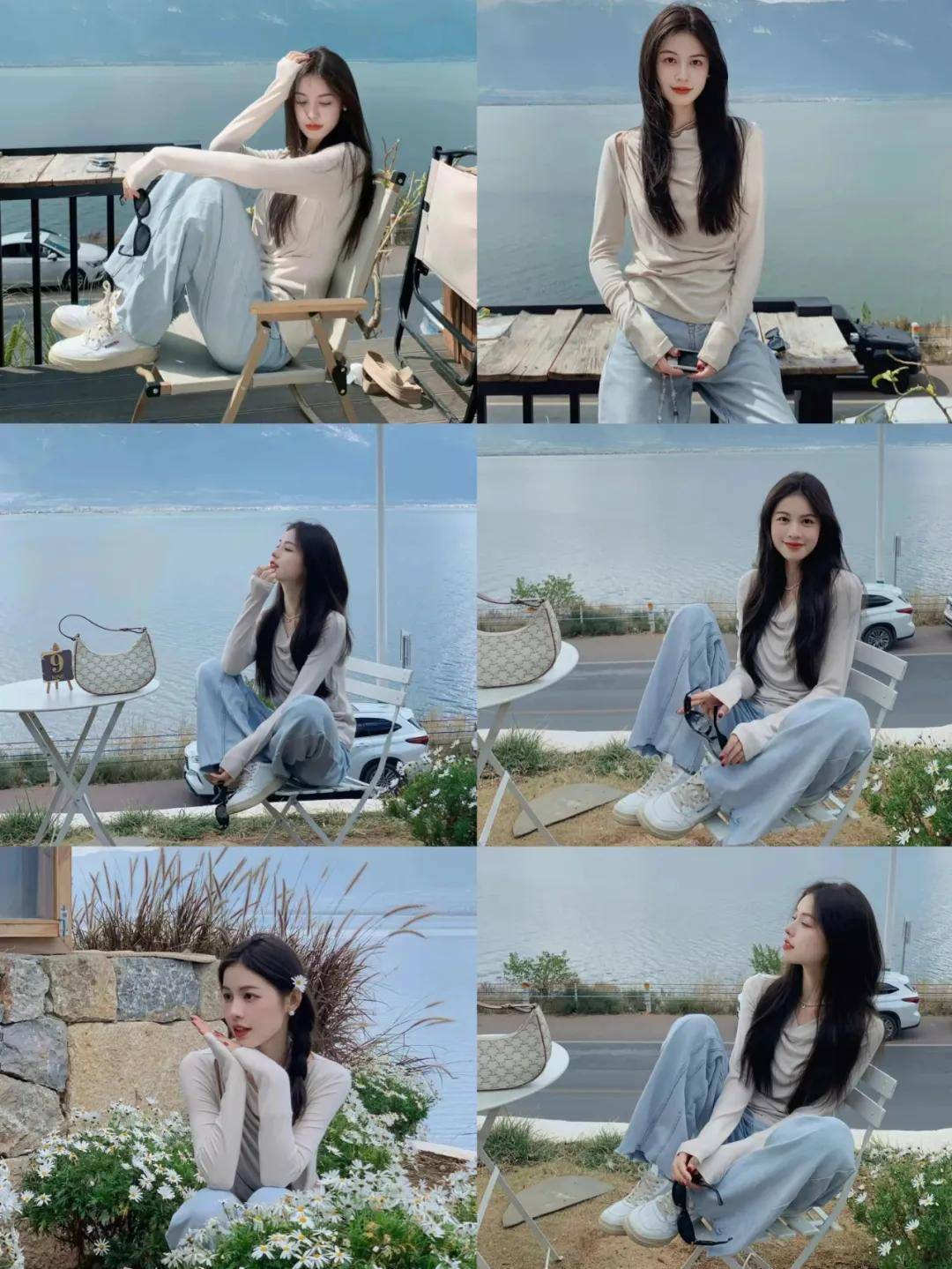 进阶版「拨发杀」专治拍照僵硬。双手轻轻抓着头发两侧,指尖带点碎发,动作要像刚被风吹乱头发时的自然整理。这个姿势特别适合半身到大半身镜头,手抬起来后画面会更舒展,肩颈线条也更流畅。如果穿吊带或V领上衣,这个动作还能不经意露出锁骨,显瘦又性感。记得眼神别直视镜头,看向斜前方45度,抓拍感直接拉满。